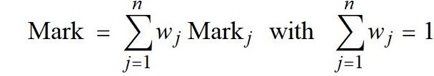 The weighted arithmetic mean of n component-marks attained for n assessments in the course, where each component is assigned a weight, and where all the weights add up to 1, is given as follows:
